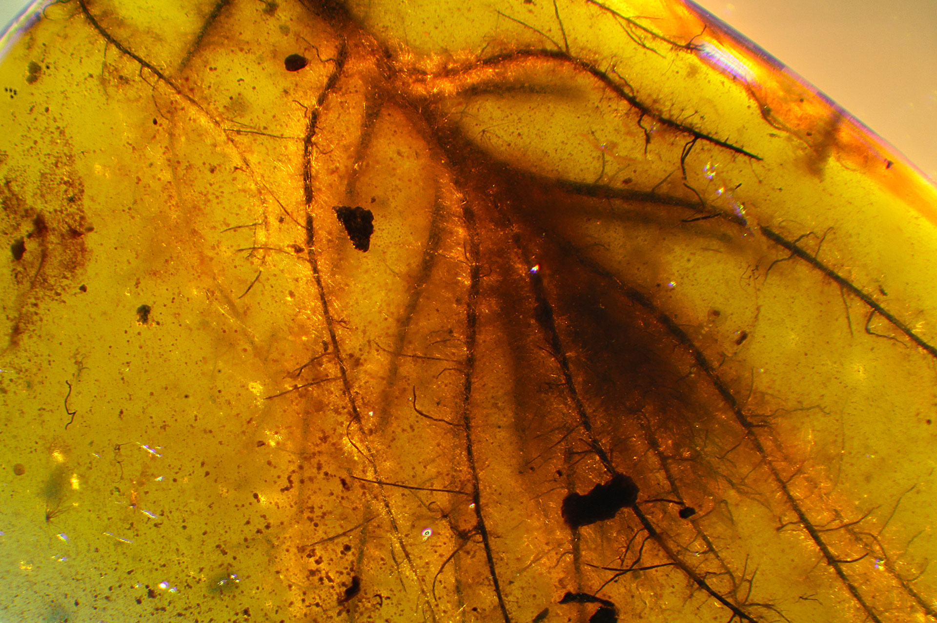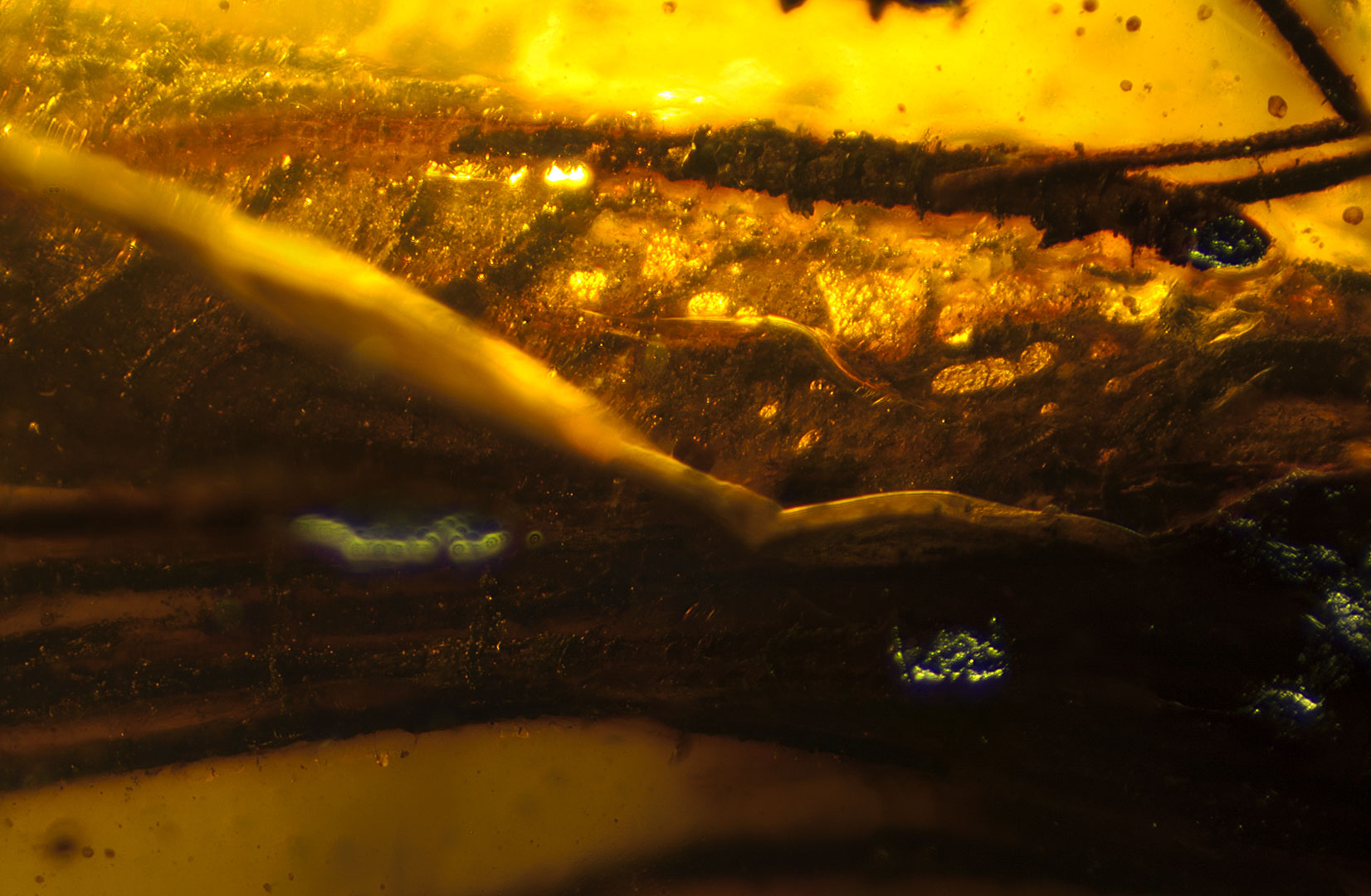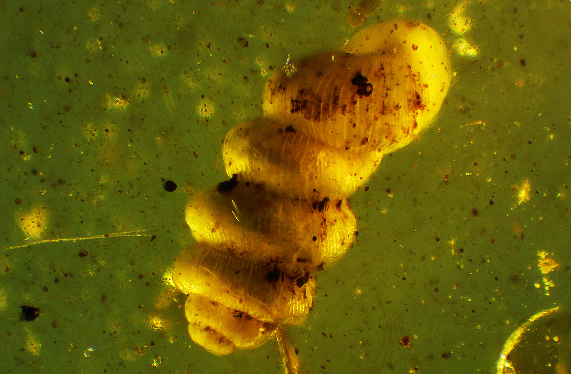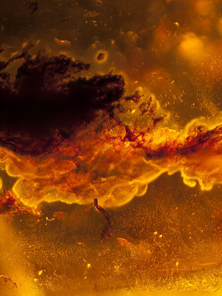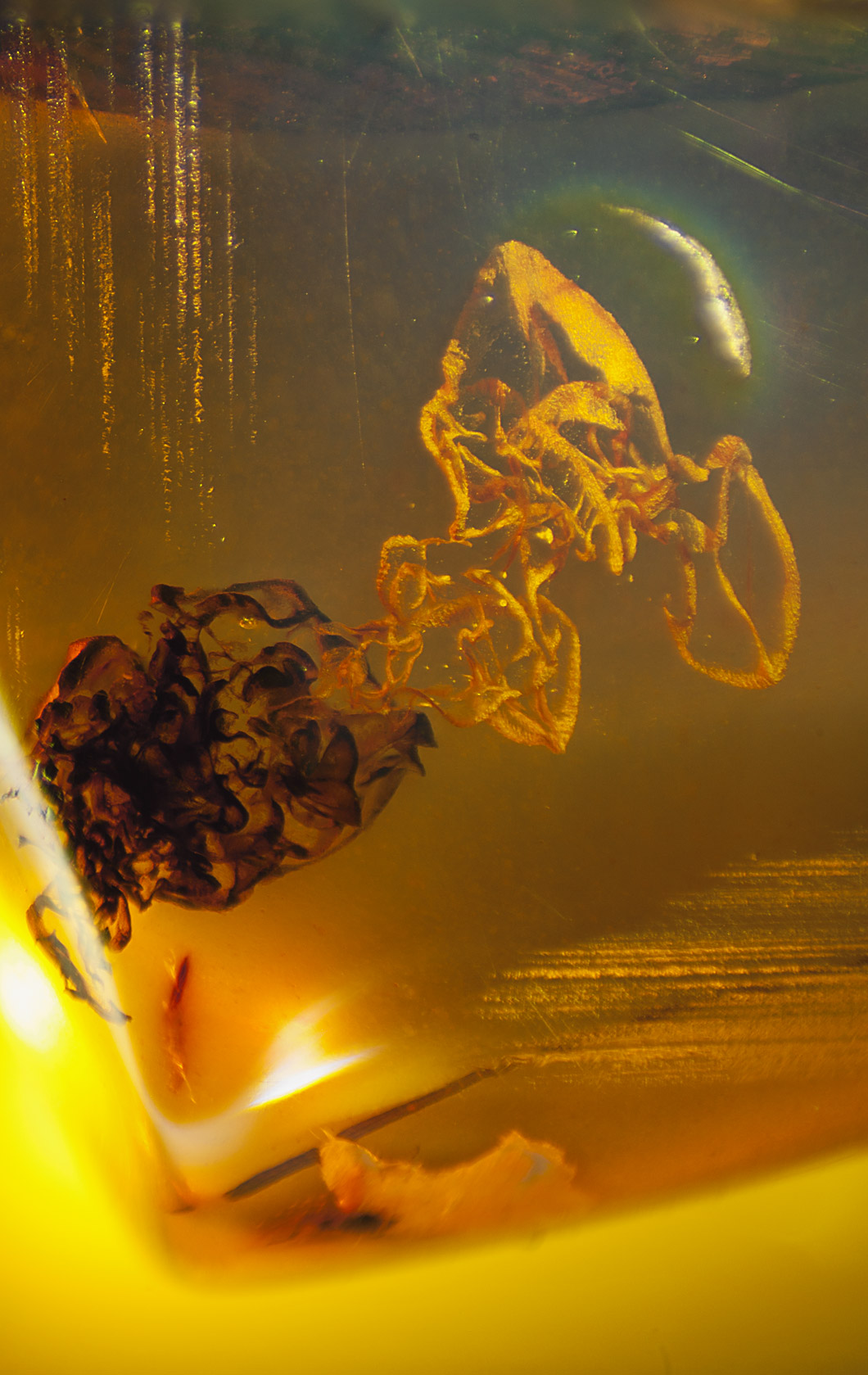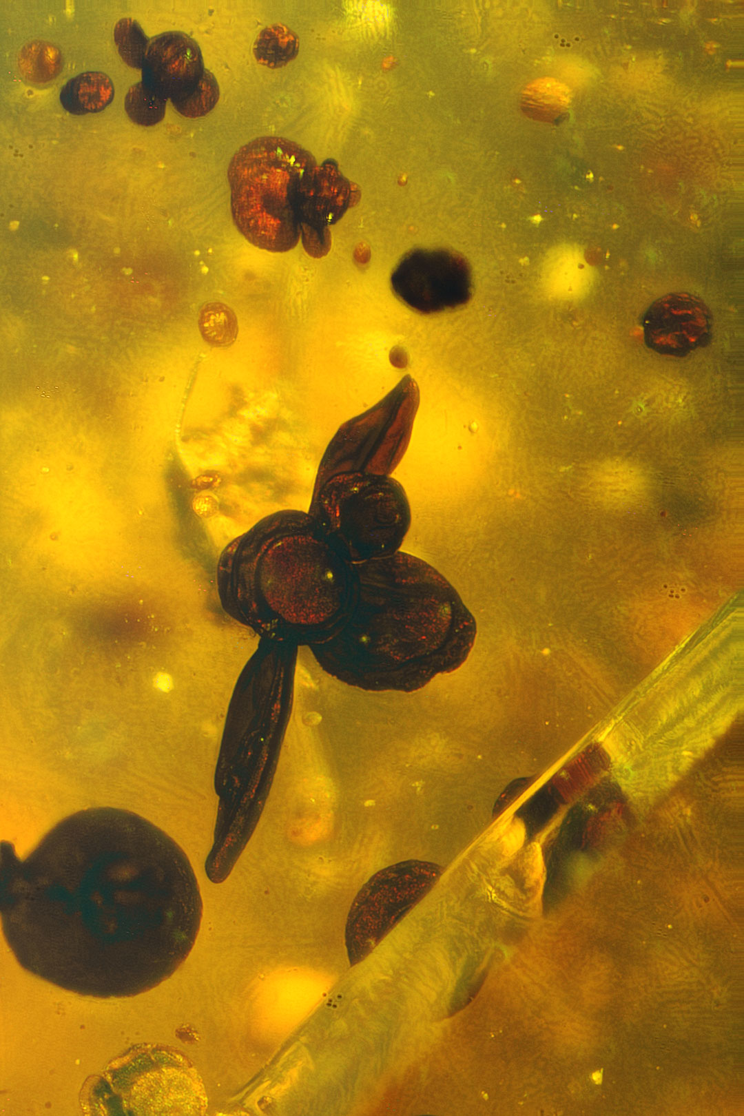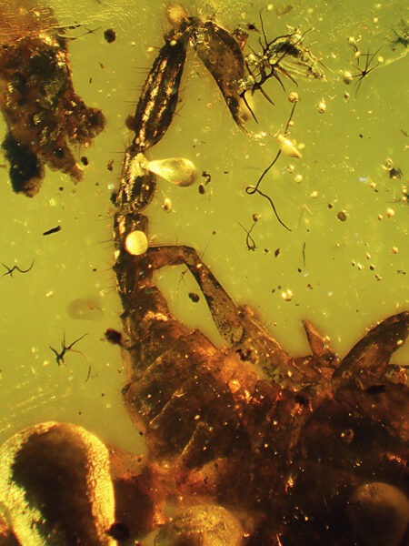 Photographs of fossil inclusions in Burmese amber. Estimated age 94-98 million years.